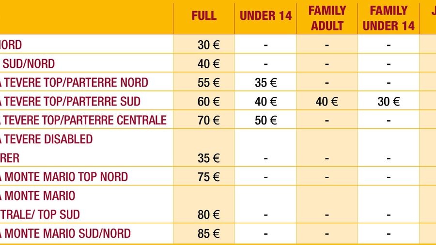 Free tickets are available from the AS Roma stores in Via Del Corso, Colonna and Roma Est and through the club’s Call Center for children under the age of 14 (born after 1/1/2005), in the sectors indicated below. These tickets may only be obtained by season-ticket holders in the same sector (you will need to show your season ticket/AS ROMA CARD + seat card), or by fans buying a full-price match-day ticket at the same time.