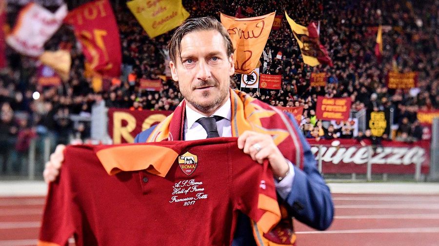 Flanked by Paulo Roberto Falcao and Bruno Conti, Totti received his special Hall of Fame shirt - before going around the ground to salute the Curva Sud.