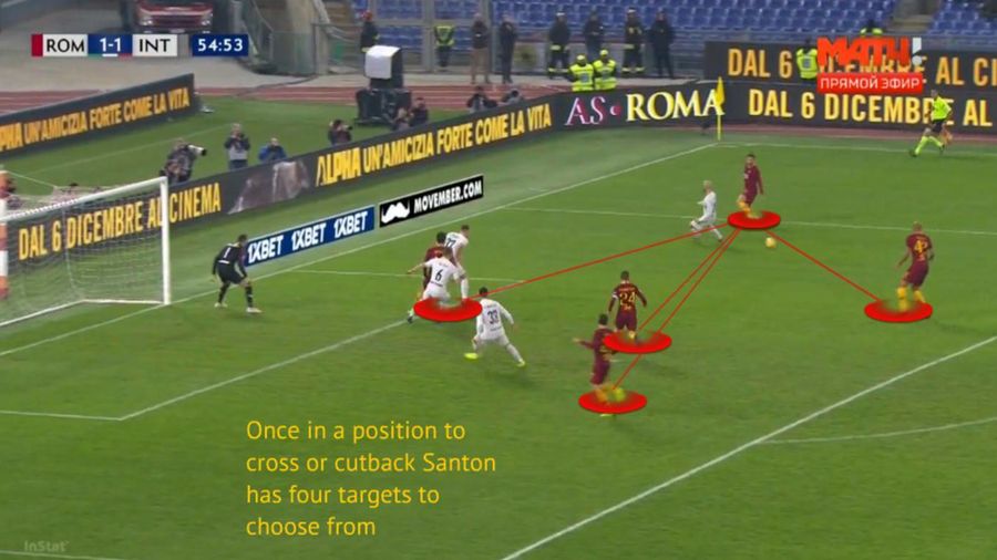 Once in possession out wide, they then attempted to whip in a cross or cutback, as Roma usually had four players attacking the box ready to latch onto any deliveries.