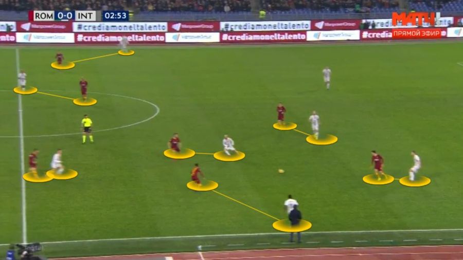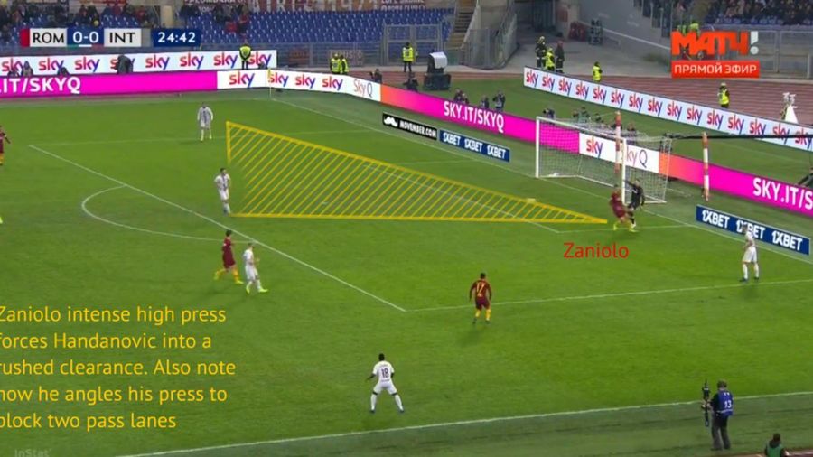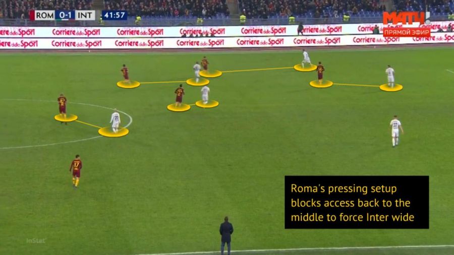 All this consequently forced Inter to one side and limited their ability to switch the play as Roma hemmed them in, which caused them to play risky passes or low percentage long balls, which enabled Roma to win the ball back on multiple occasions.