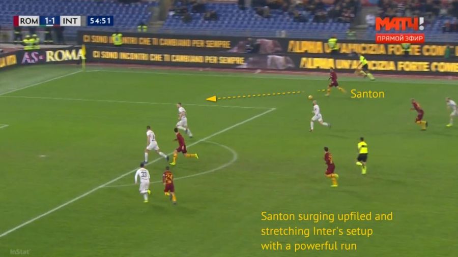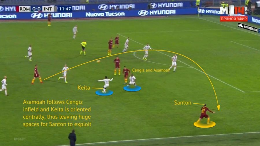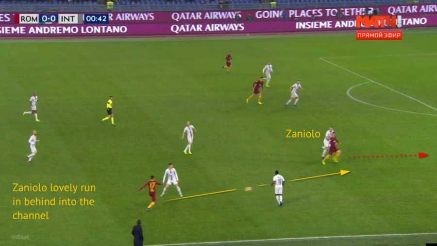 Seeing as Inter dropped back into what was ostensibly a narrow 4-1-4-1 shape, this left inherent spaces out wide for Roma to exploit. With Inter's wingers content to stay in their shape and Luciano Spalletti instructing his fullbacks to stay tight to their winger, Roma's fullbacks subsequently had some vast spaces to charge into due to Roma's wide men typically venturing infield.