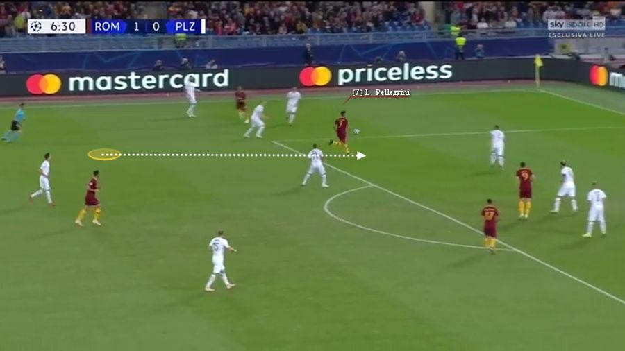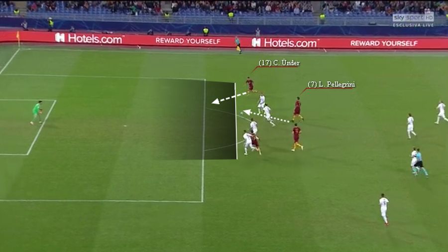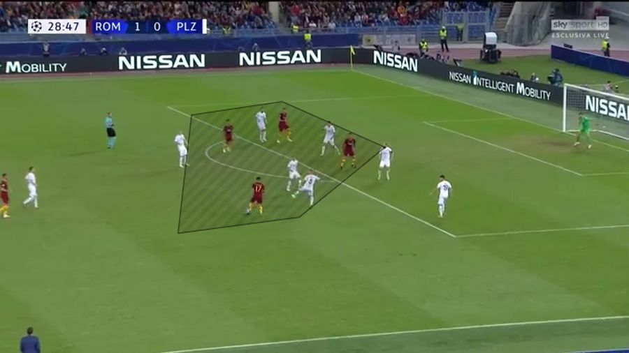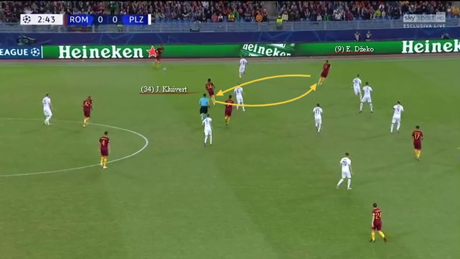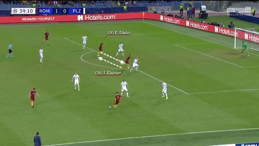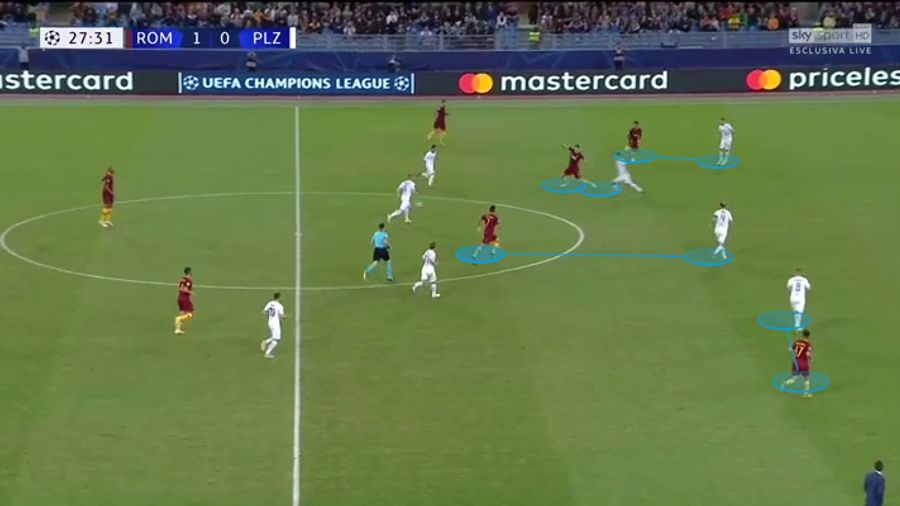 Playing in their 4-2-3-1, a key element of this formation has been the way Roma's central attacking presence has helped make them far more dangerous. With Under and Kluivert typically coming infield from the wing to occupy spaces in the half or 10 spaces, this gave Dzeko and Pellegrini vital additional nearby options vs. Plzen.