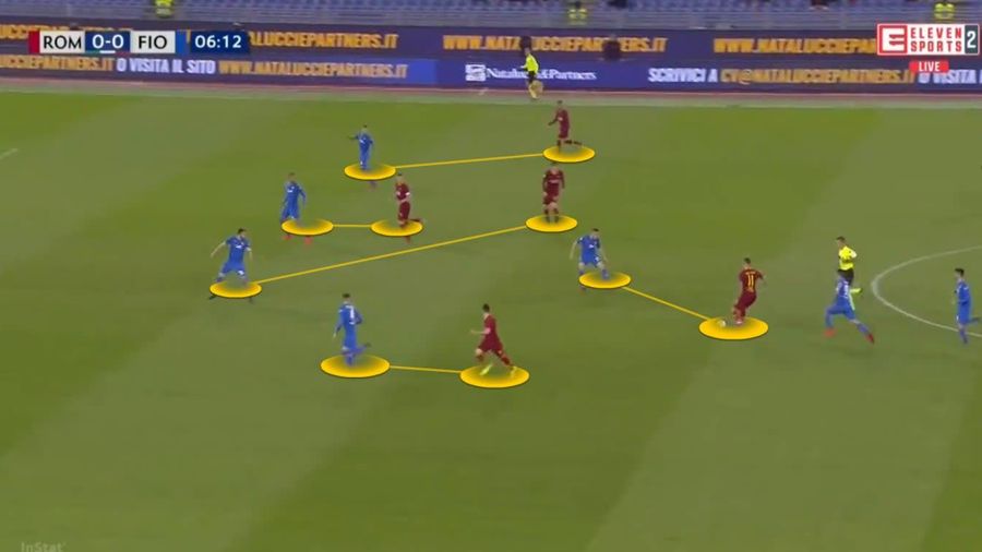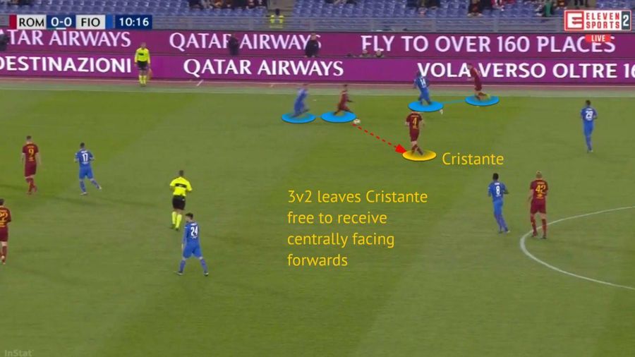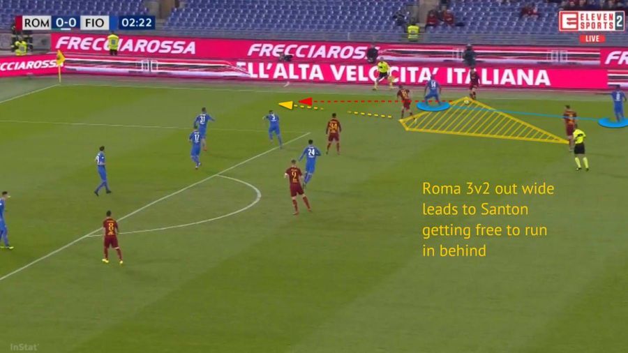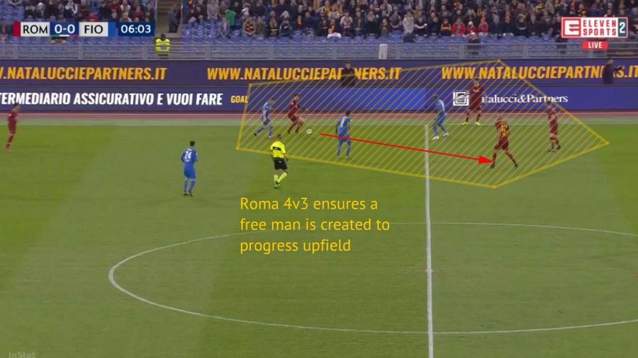 Vital to this was how Roma would often be 4v4 or 5v5 vs. Fiorentina's backline, meaning their foes had minimal room for error and couldn't afford to commit any mistakes or a Roma attacker would be clean in.