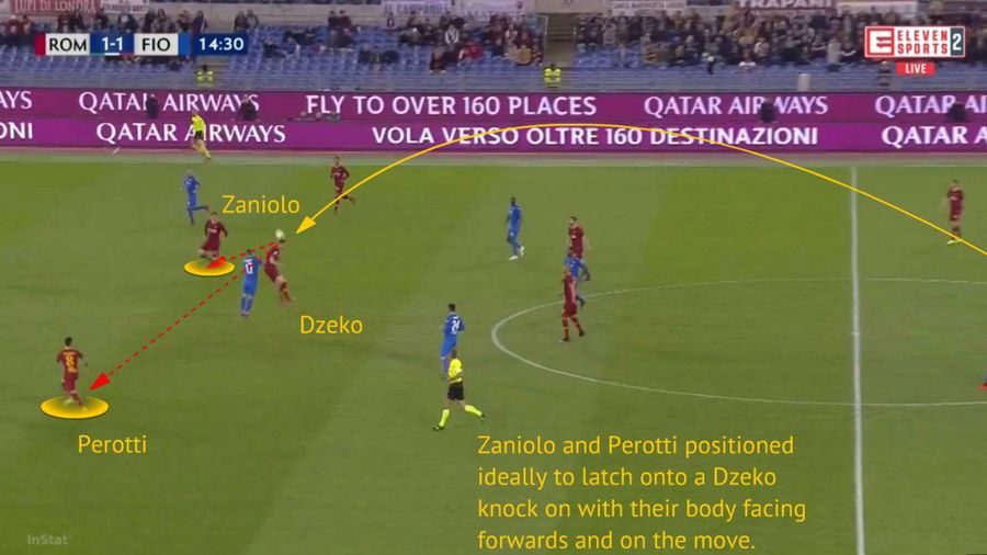 Manufacturing many encouraging moves on the counter attack too, Roma's attackers made sure to occupy different zones, thus giving the ball carrier many options and enabling them to pin or draw their markers to create exploitable space.