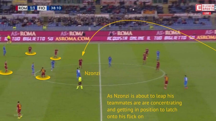 With Ranieri stating his desire for his team to not take any unnecessary risks when building out from the back, there was inherently many long balls played upfield when Roma were placed under heavy duress. Knowing he had aerial powerhouses such as Edin Dzeko and Steven Nzonzi at his disposal, the Italian tactician used this to good effect.