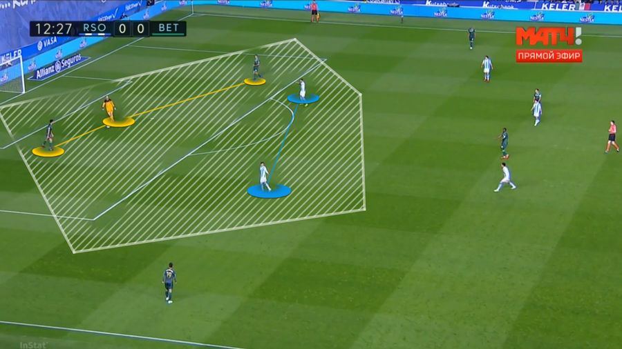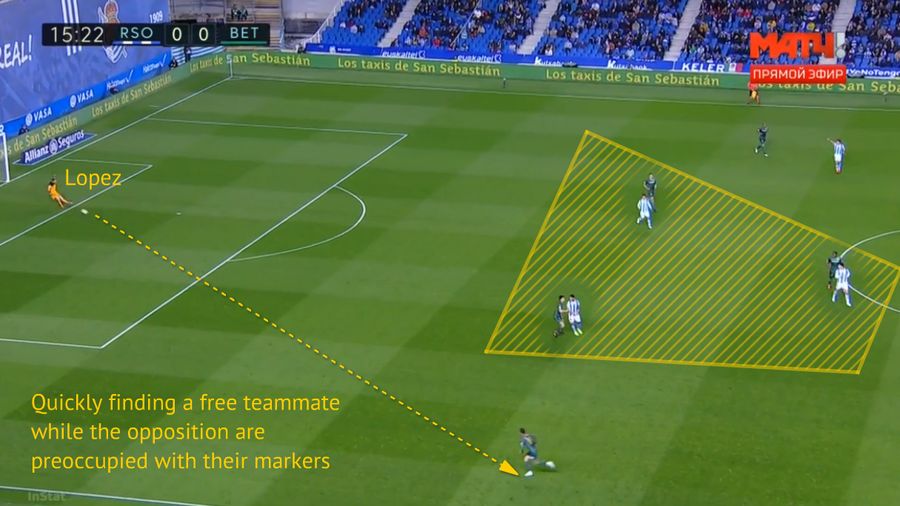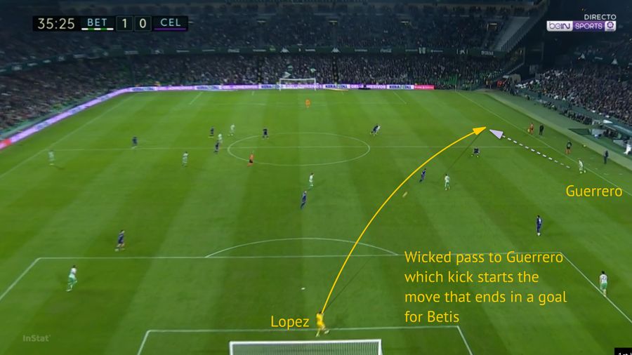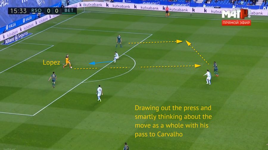 Keeping his eyes open to find the free man, a key tenet of Setien's positional play strategy with Los Verdiblancos, he did this effectively by using his vision, awareness and technical qualities.