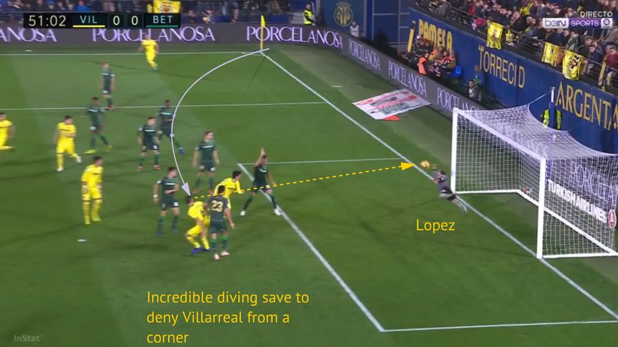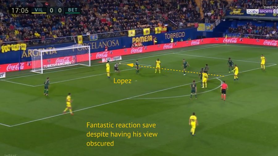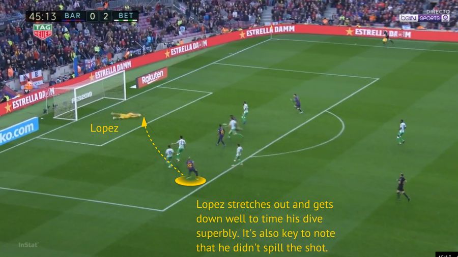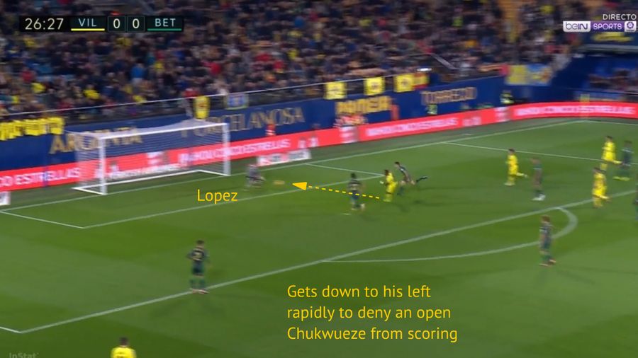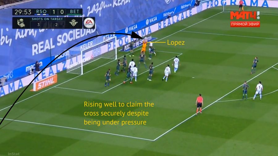 Shifting the focus to his shot-stopping skills, the once-capped Spanish international has illustrated his prowess here nicely. Using his 189 cm frame and huge wingspan, in combination with his concentration and sound positional sense, Lopez typically does a neat job of closing off shooting angles and making the net smaller for opponents.