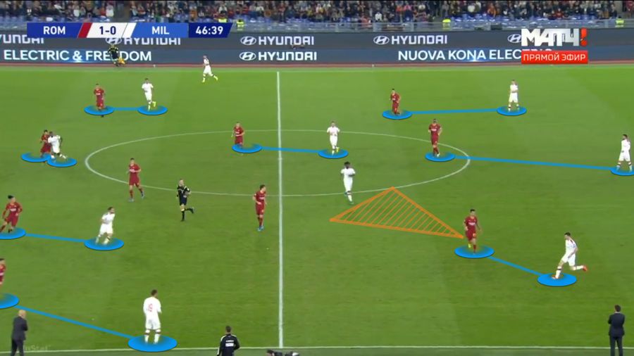 Whether AC Milan were building out from the back in a central back two or three, Roma pressed their first line impressively to cause many turnovers by limiting their options. Timing their harrying to close off central areas by using their cover shadows, Milan struggled heavily to find solutions to bypass the Wolves.