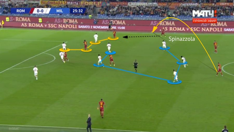 The way Zaniolo then positioned himself high and infield enhanced the room for Spinazzola to enjoy, for Zaniolo pinned his man, meaning they were reluctant to jump out to press Spinazzola.