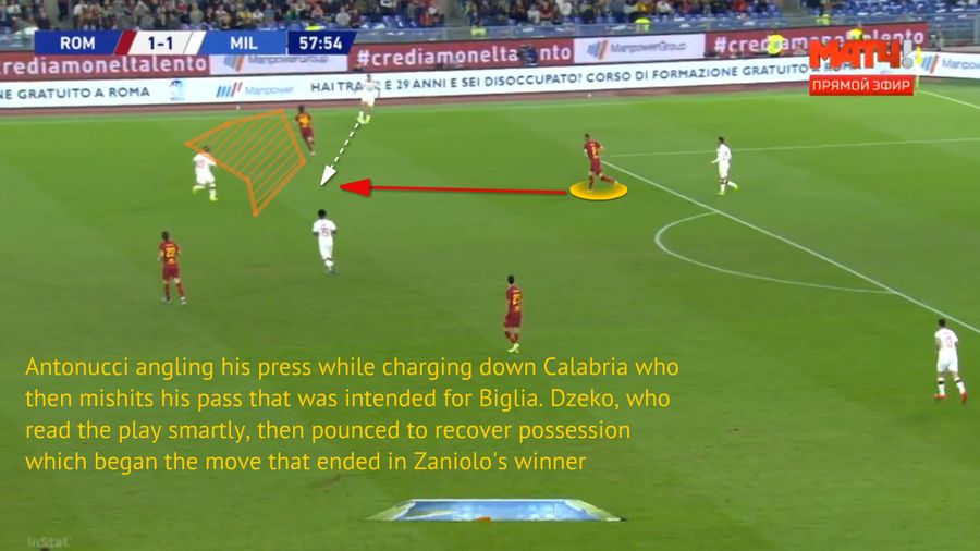 A perfect example of their effectiveness arose in the lead up to Zaniolo's winner, where Mirko Antonucci smartly angled his intense press at Davide Calabria, meaning Calabria mishit his intended pass to Lucas Biglia.