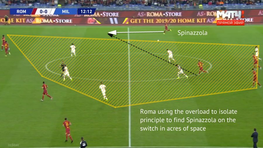 This overload to isolate strategy especially took flight when Roma switched the play over to the right, where Leonardo Spinazzola relished receiving in oceans of space to use his dynamic skill set to drive his team forward and provide width.