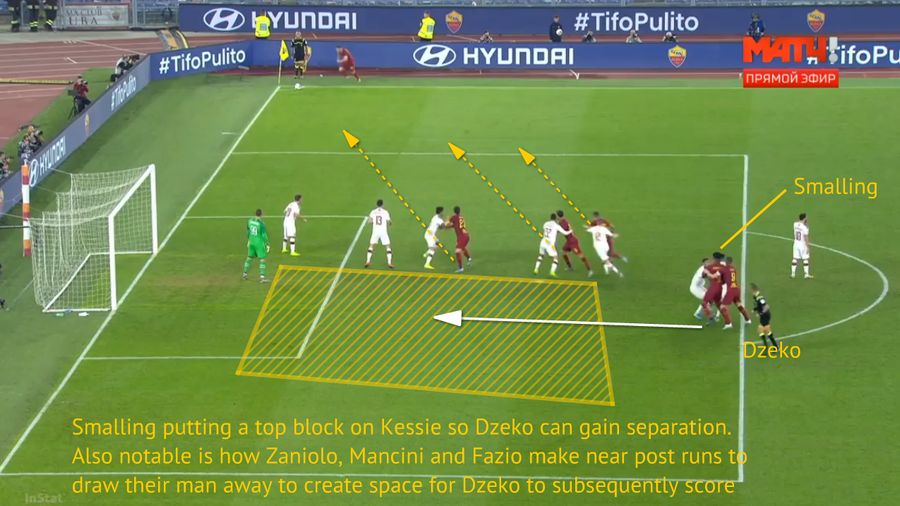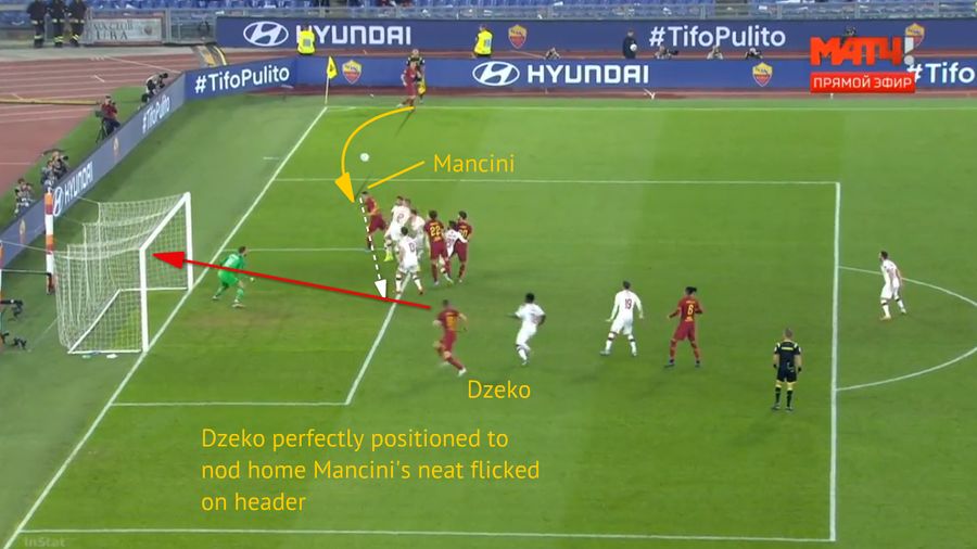 To start with, Gianluca Mancini, Zaniolo and Federico Fazio made smart decoy runs towards the near post, which drew their respective markers with them. This inherently generated plenty of central space for Dzeko to ultimately exploit while ensuring Mancini was in an ideal position to flick on Jordan Veretout's corner.