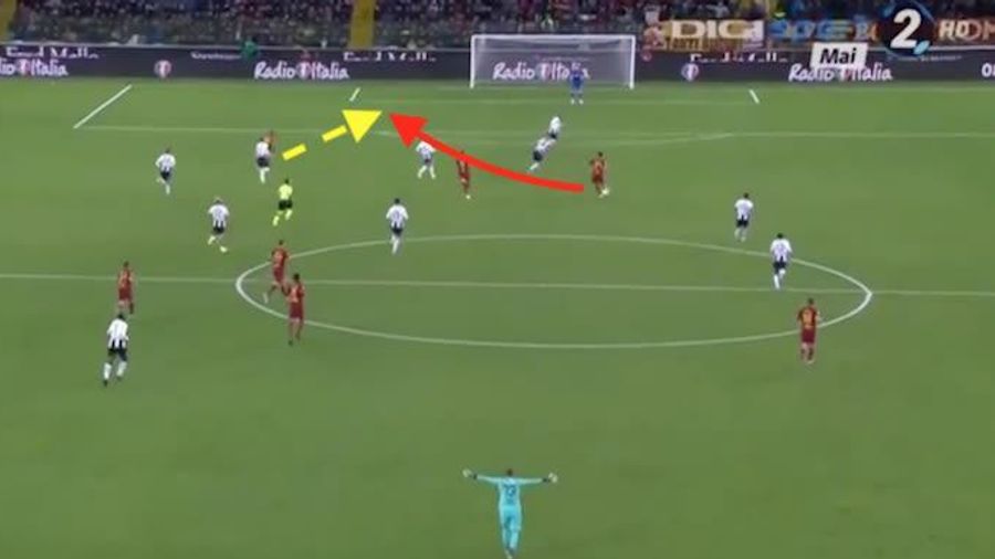 El Flaco saw that Udinese had overcommitted going forward and were completely unbalanced down their right, with Roma quickly moving the ball down the flank. It was then played inside, while Kolarov busted a gut to get forward in support. He spotted Kluivert's run from right to left in behind Mato Jajalo, while Nicolo Zaniolo was bursting down the right in space.