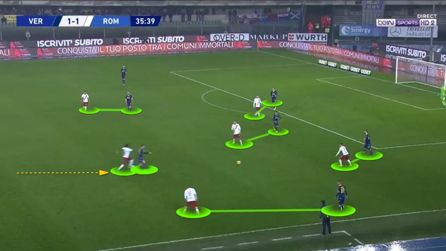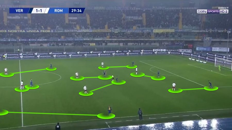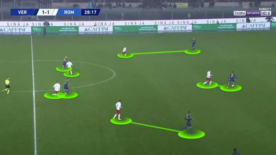 Roma's fullbacks would usually step out to Verona's wingbacks while Amadou Diawara would keep tabs on trequartista Valerio Verre, who looked to occupy spaces between the lines. Lastly, Gianluca Mancini and Chris Smalling would look after the opposing front two of Samuel Di Carmine and Mattia Zaccagni, and be given support from the fullbacks or midfielders if needed.