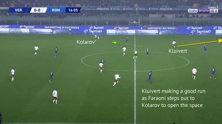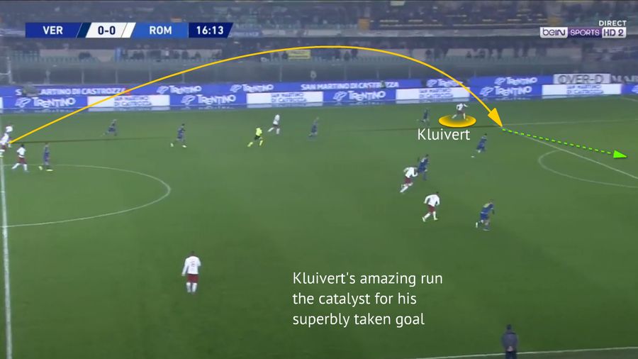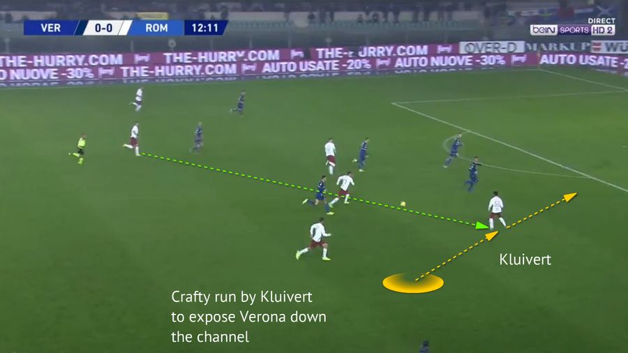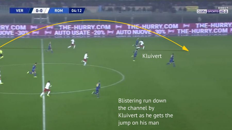 Taking advantage of when Marco Faraoni or Darko Lazovic were pressing high or got caught high and out of position when Roma forced a turnover, Kluivert and Under were wide awake to the spaces open to them both in transition sequences or more methodical possession phases.
