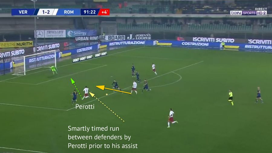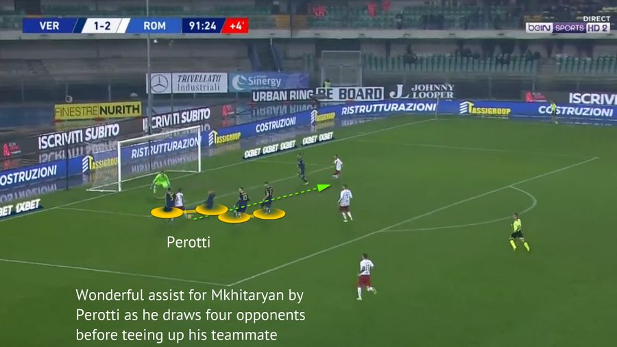 Meanwhile, his distribution was also tidy too, as on top of combining neatly in close quarters with some neat layoffs and one-twos, he helped Roma seal the win with a lovely, deft assist for Henrikh Mkhitaryan's goal after notably drawing four Verona defenders.