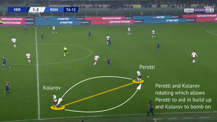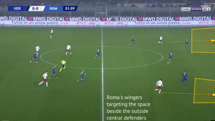 Boasting two blisteringly quick wingers in Cengiz Under and Justin Kluivert, these two speedsters were vital in exploiting the space down the channels either side of the Verona back three. Identifying the vast space available here due to Verona fullbacks marauding forward, this was an avenue that frequently bore fruit for the Giallorossi.