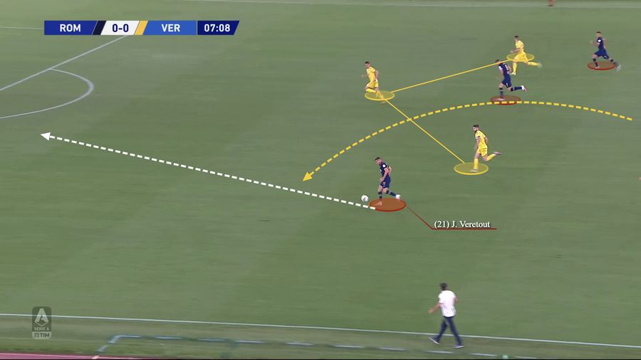 By then factoring in how Veretout and the wing-backs would also relish bombing forward, this punctuated their danger. Persistently causing marking dilemmas for the backpedaling, under pressure Verona backline, in combination with how they'd stretch and run quality routes to either be in an option or draw markers away, this saw their threat heightened.