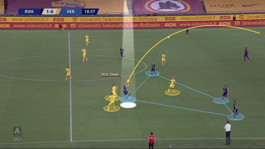 From this coordinated structure Dzeko had many options around him, as Roma often created a 4v3 or 3v2 overload around Dzeko to enhance their chances of regaining the ball high so they could immediately attack Verona with players receiving in advantageous forward facing positions.