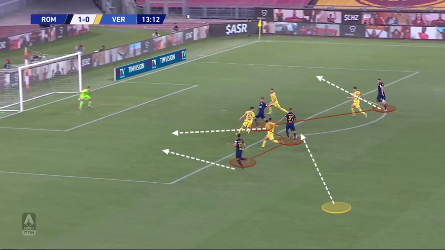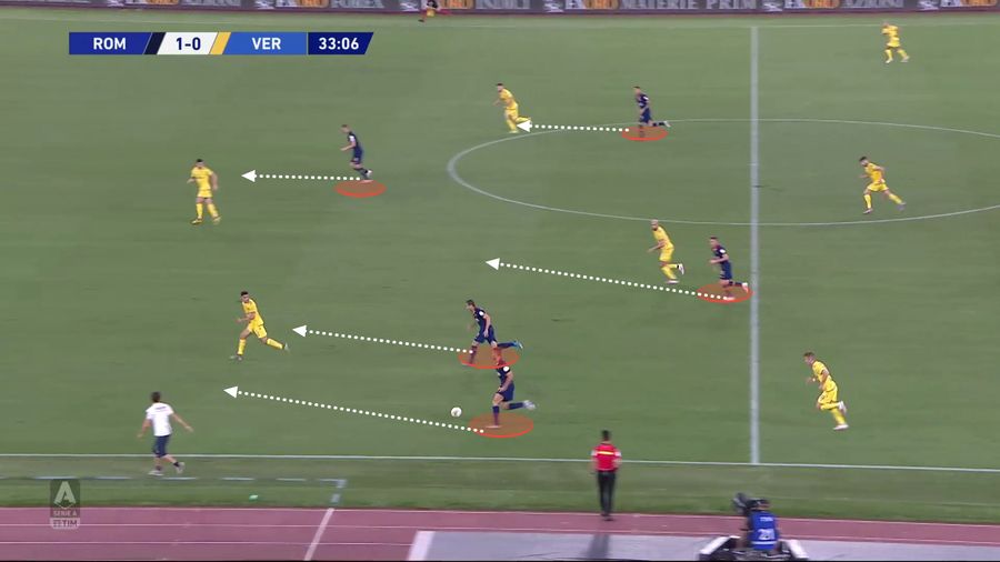 Seeing as the front three were pressing Verona's back three, this meant when Roma regained possession they had three outlets to find and could regularly generate favourable 5v4, 4v4 and 3v3s in transition.