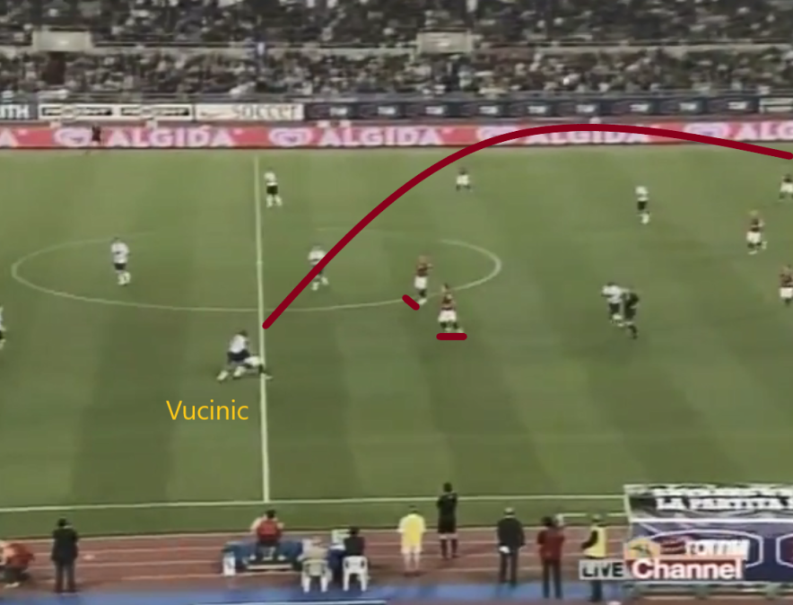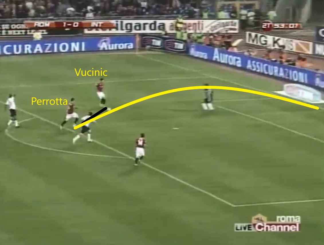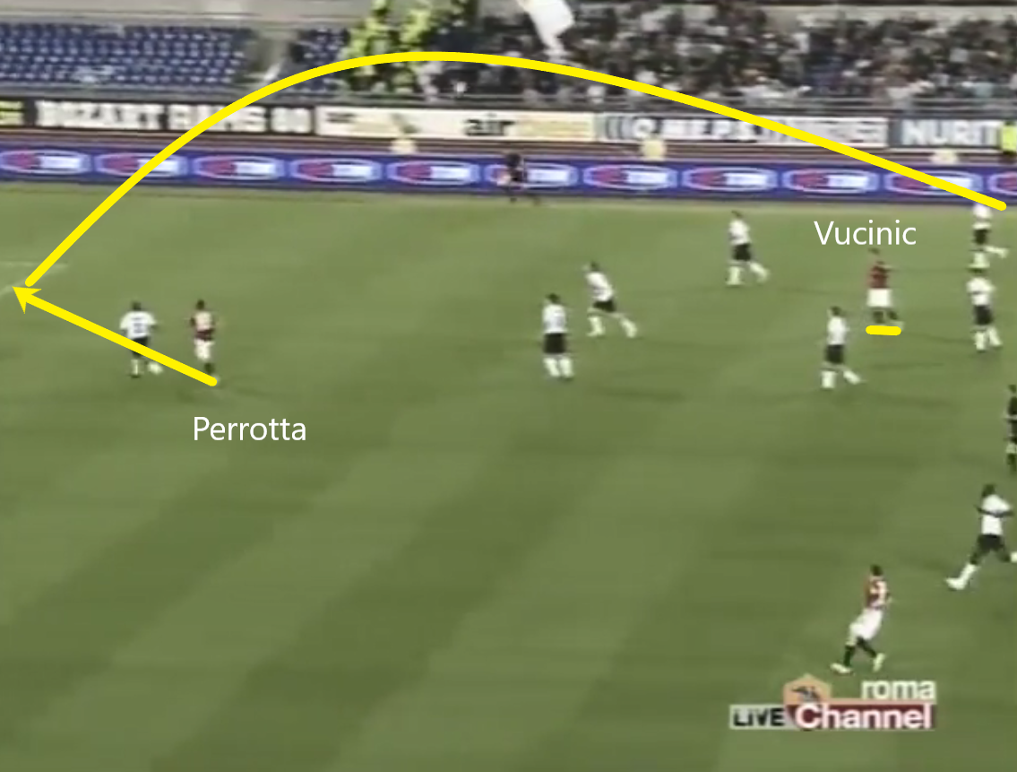 Perrotta and Vucinic's relationship deserved special mention, for their understanding was first class in dismantling their foes' backline. They did so in two ways especially, with neat rotations and opposite movements. For the former, when Perotta was out on the left, he'd come infield and Vucinic would then drift wide, where the Montenegrin loved receiving 1v1 against his man and using his powerful running and dribbling to get at the defence.