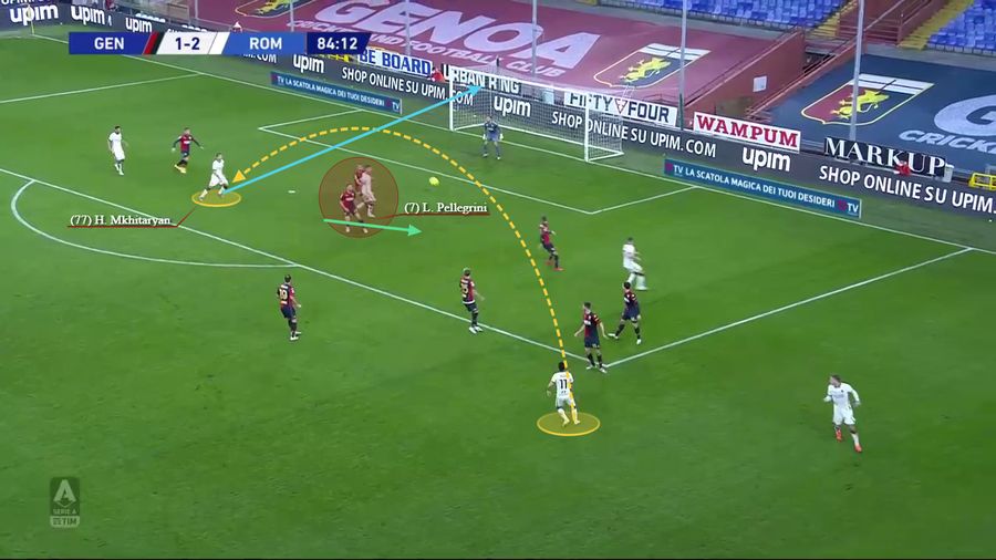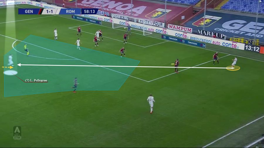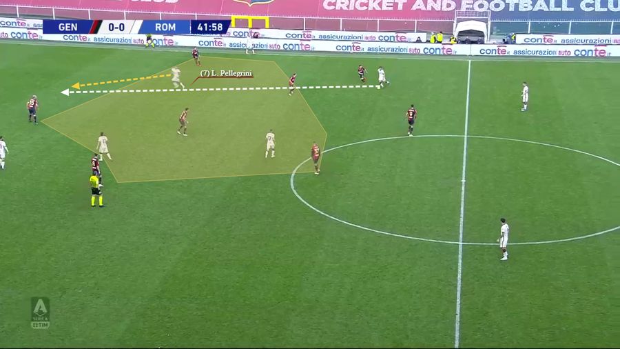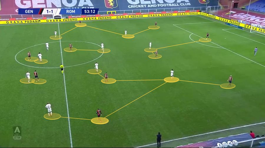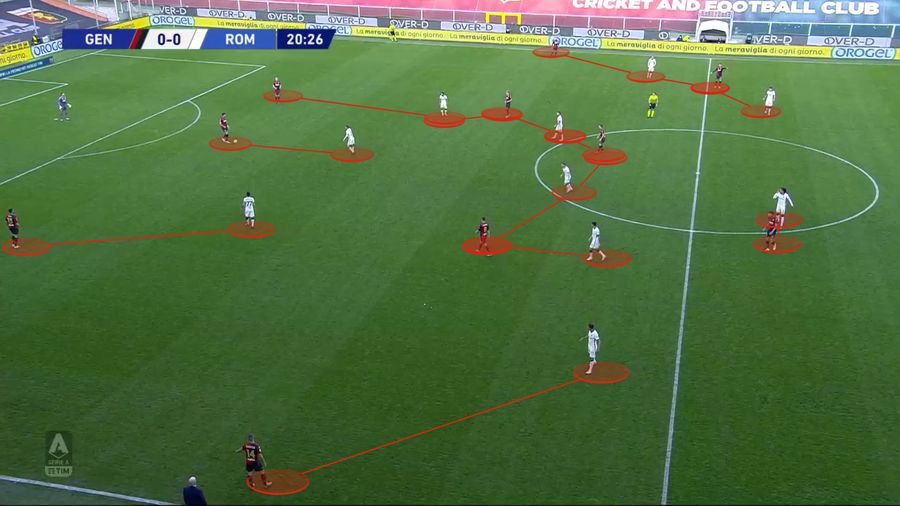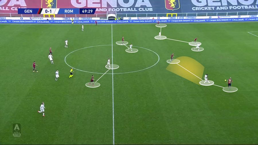 With Genoa usually enjoying a 4v3 numerical superiority against Roma's first line of pressure, Roma were sharply positioned to access multiple opponents depending on where the ball was played to overcome being overloaded. Moreover, how they'd curve their pressing to use their cover shadows to block options behind them was also crucial.