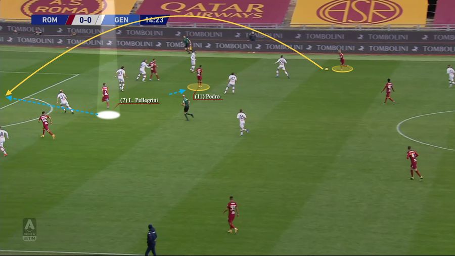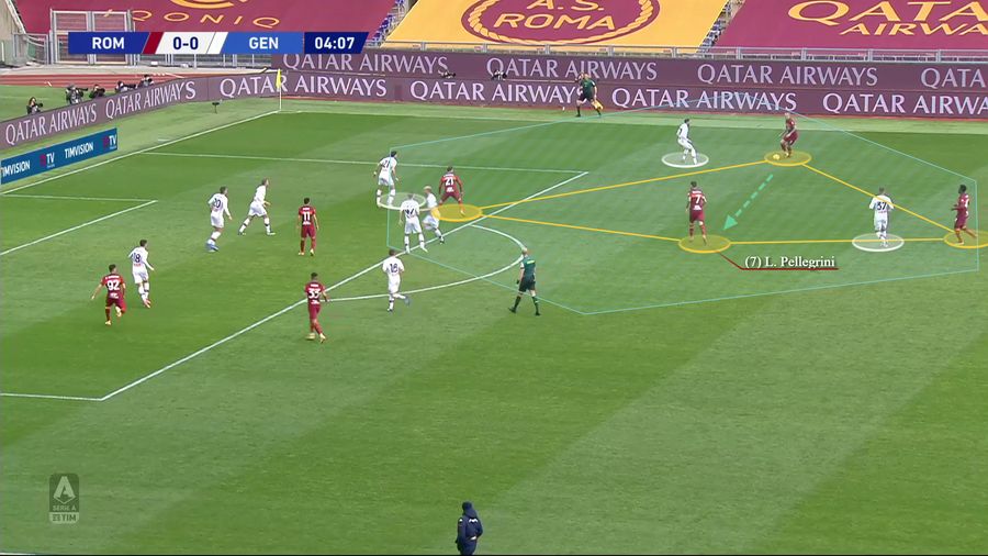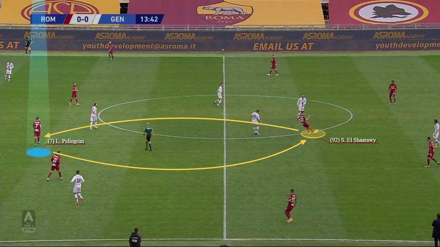When Roma had Genoa pinned back defending deep, there were many cases when he'd step into midfield to add an extra number to the attacks, hoping to lure out a presser or to use his penetrative distribution to unlock his adversaries.