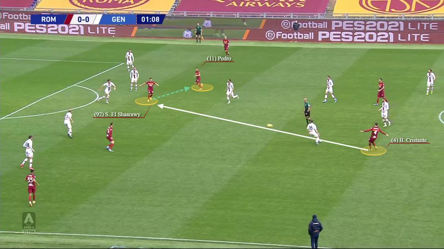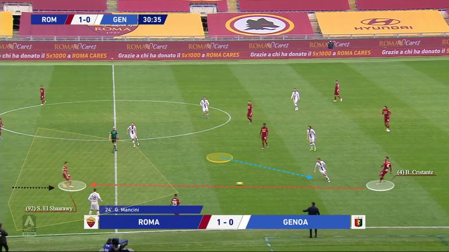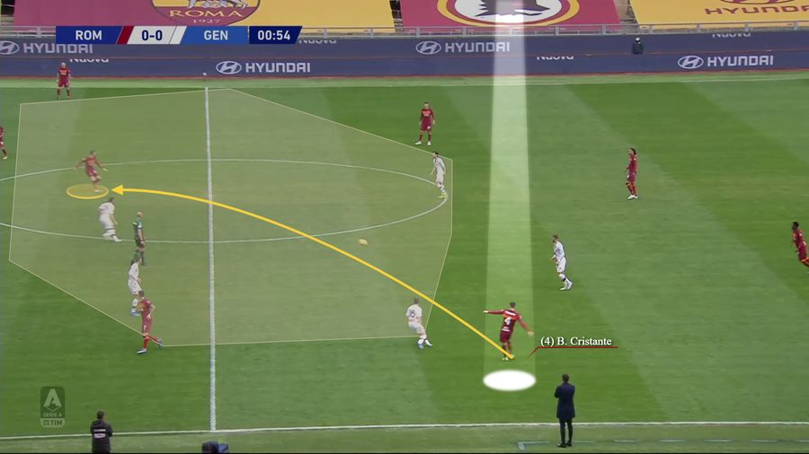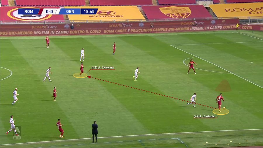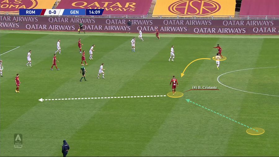 From this post, Cristante was persistently able to receive possession with plenty of time and space due to Roma enjoying a 4v3 or 3v2 overload against Genoa's first line of pressure. The way Amadou Diawara would drop into the first line further stretched Genoa, with this serving as the trigger for Cristante to push wider, where he found freedom and could gain a good picture of potential options.