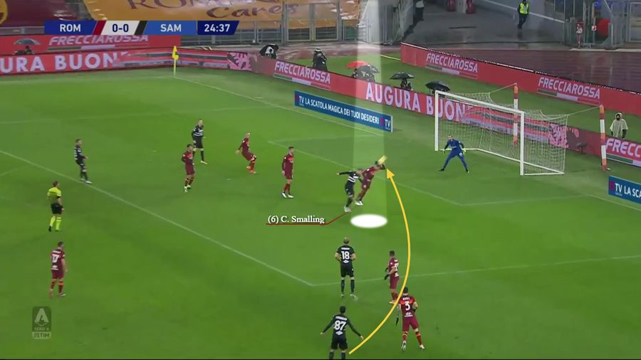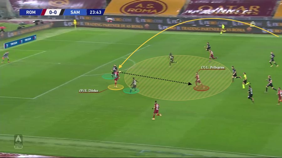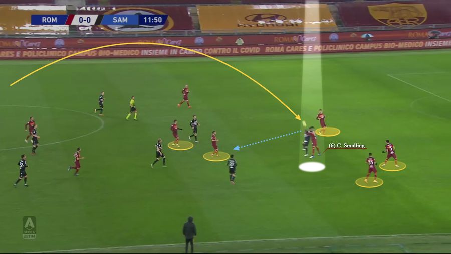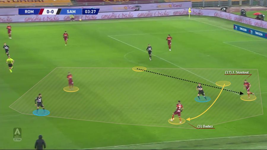 This strategy helped Roma dictate proceedings and cause confusion within Samp's pressing setup on who to press in what zone. As a result, Roma were able to lure out their opponents while creating overloads, which saw them often able to beat the press.