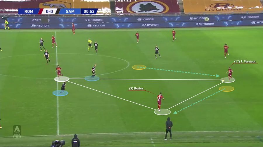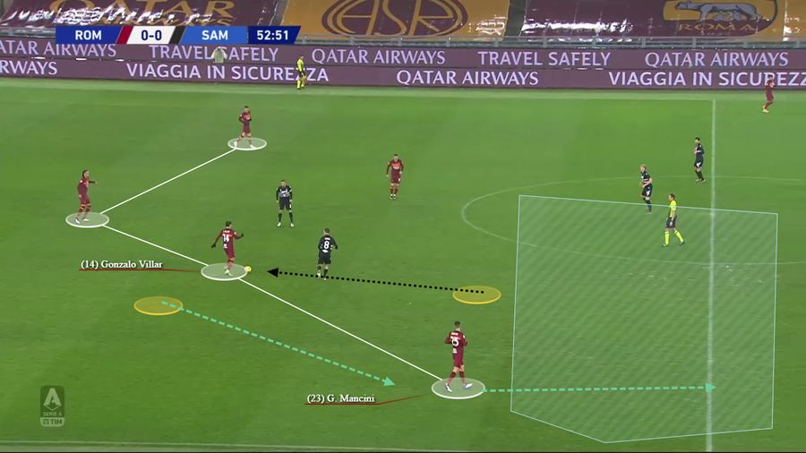 An interesting component of Roma's build up was the movement of central midfielders Jordan Veretout and Gonzalo Villar. Whenever Roma were passing out from the back, one of the two men would drop back alongside Smalling, which was the trigger for the ball near outside centre back, either Roger Ibanez or Gianluca Mancini, to push wide into a fullback position.
