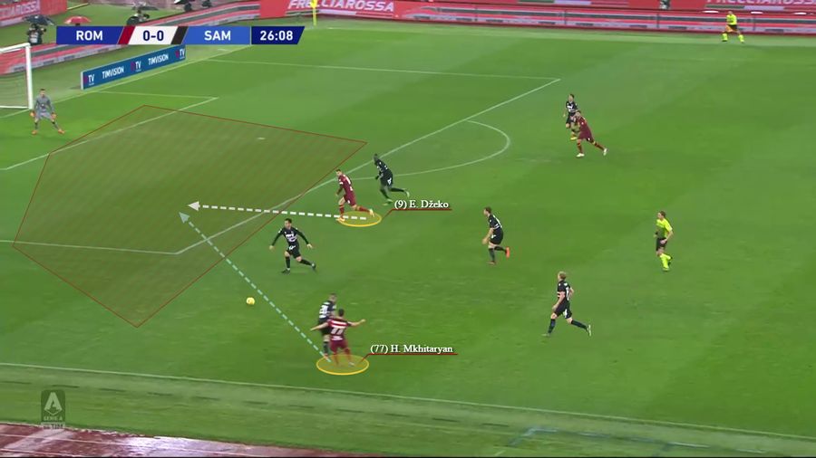 Seeing as one of Samp's mids would jump to Veretout or Villar, which Henrikh Mkhitaryan or Lorenzo Pellegrini would be awake to, this crucially allowed Roma's dual 10s to exploit the openings that arose in midfield.