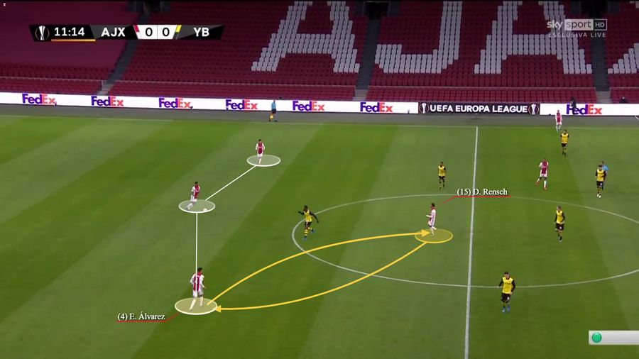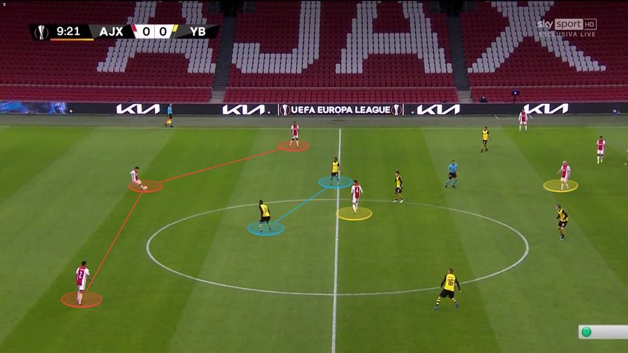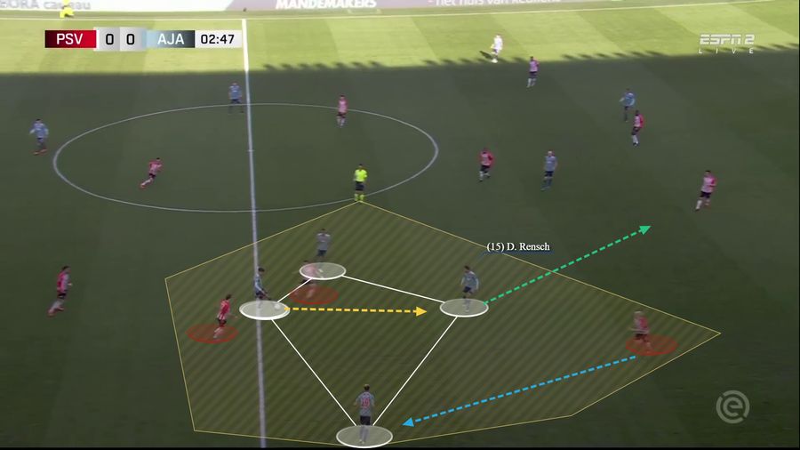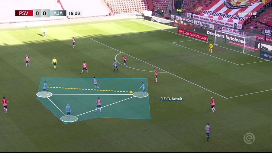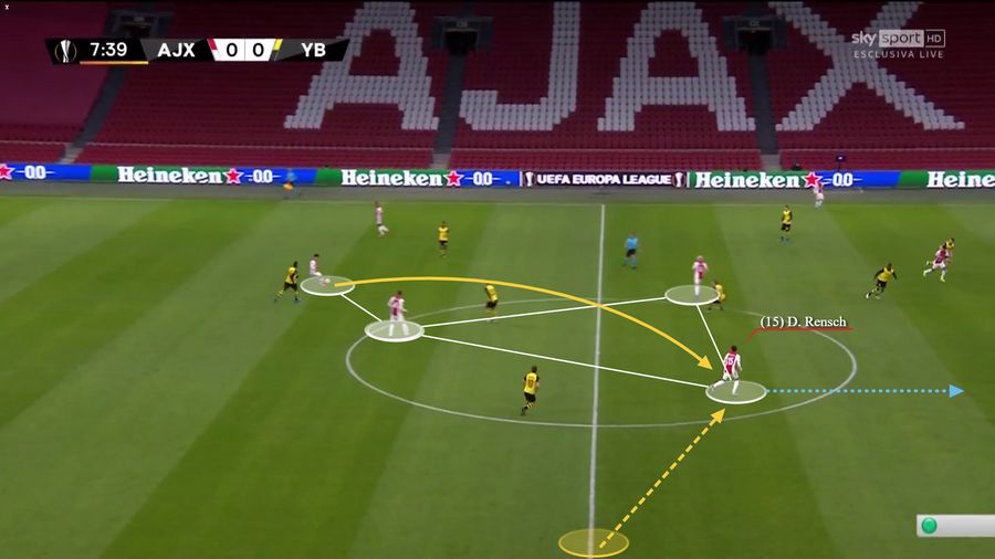 Experts at causing dilemmas for markers, it's been notable how nominal right back, Devyne Rensch, will sometimes push infield and act as an extra midfielder. In doing so, not only can he help give his team positional and numerical superiority to break the press, but also so his team can control counter attacks better once possession is lost.
