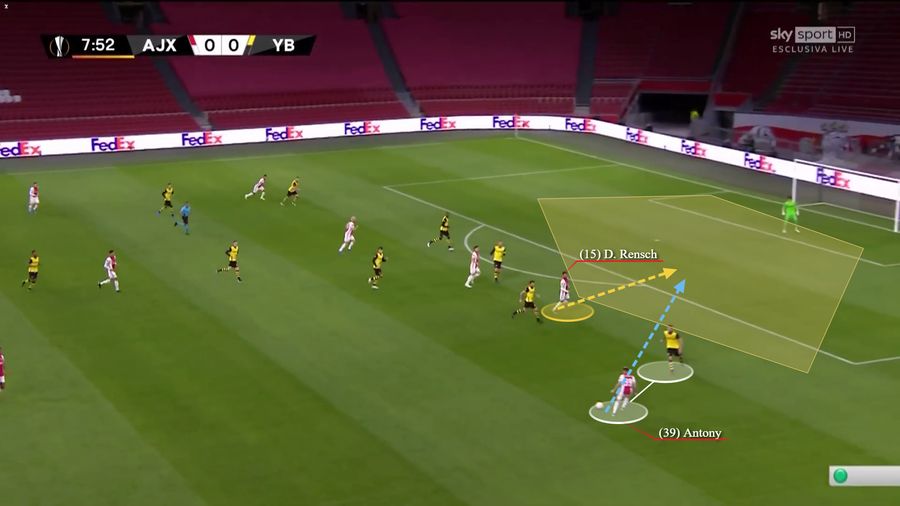 In addition, as the ball progresses higher, electric winger Antony will regularly pull wide so he can be 1v1, which subsequently opens spaces in the channel for Rensch to maraud forward with crafty underlapping runs that can catch defences off guard.