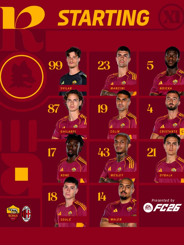© 2018-2025 Soccer S.r.l. – EU VAT IT09305501000 - all rights reserved. The AS Roma names, logos and artwork are registered or unregistered trademarks of Soccer S.r.l. All other trademarks may be the property of their respective holders.