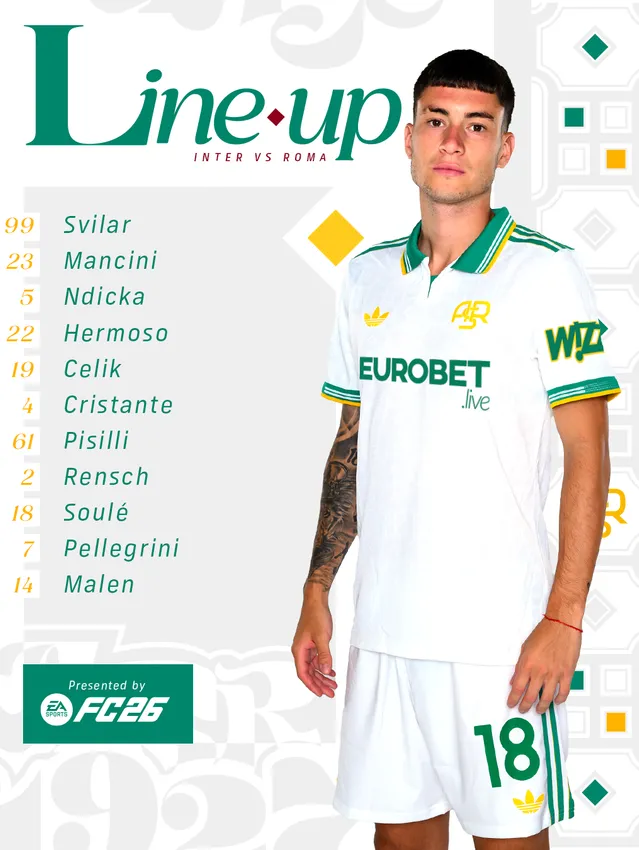 © 2018-2026 Soccer S.r.l. – EU VAT IT09305501000 - all rights reserved. The AS Roma names, logos and artwork are registered or unregistered trademarks of Soccer S.r.l. All other trademarks may be the property of their respective holders.