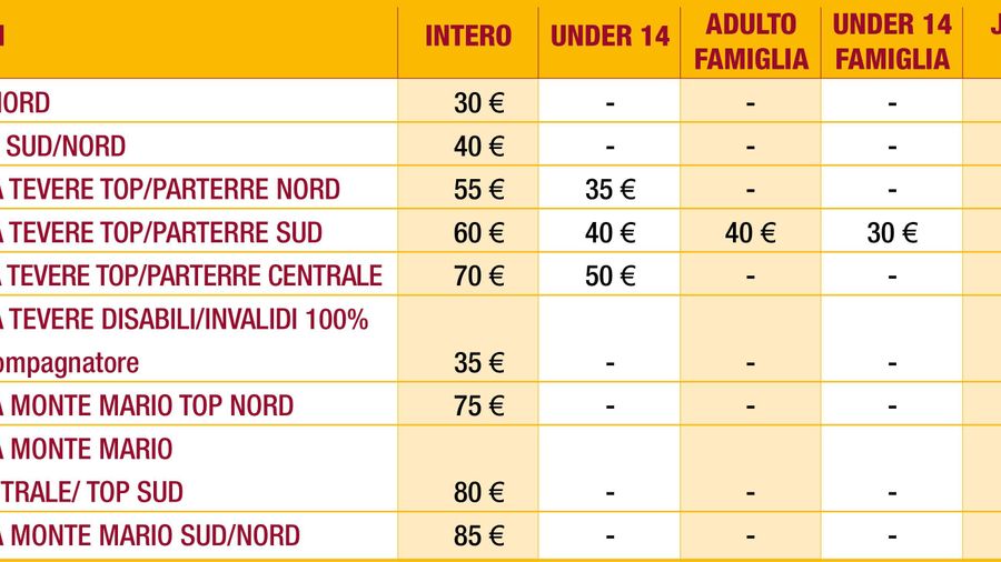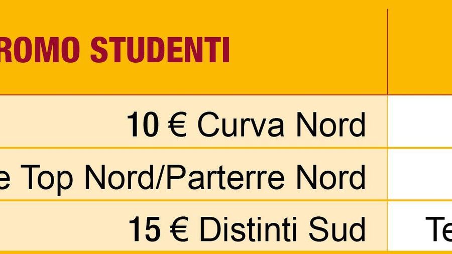 AS Roma dedicherà una tariffa speciale per gli studenti di ogni ordine e grado nei settori indicati nella tabella pubblicata di seguito. Sarà sufficiente recarsi presso tutti gli AS Roma Store o chiamare il Call Center e presentare un documento d’identità per gli studenti della scuola dell’obbligo e superiore o il tesserino universitario per gli iscritti all’Università.