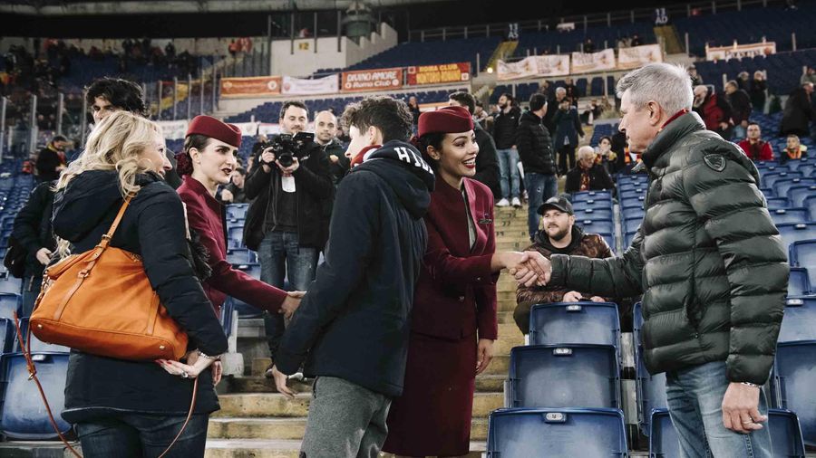 Il momento clou per i vincitori di questo concorso è sempre l’incontro con la squadra all’interno dell’hotel. Di solito oltre all’emozione può nascere un po’ di timidezza. Michela invece ha dimostrato di sentirsi completamente a suo agio e ha approfittato per esprimere il proprio affetto e incoraggiamento a tutti, da Dzeko a Zaniolo, da Juan Jesus a Kluivert e Perotti…