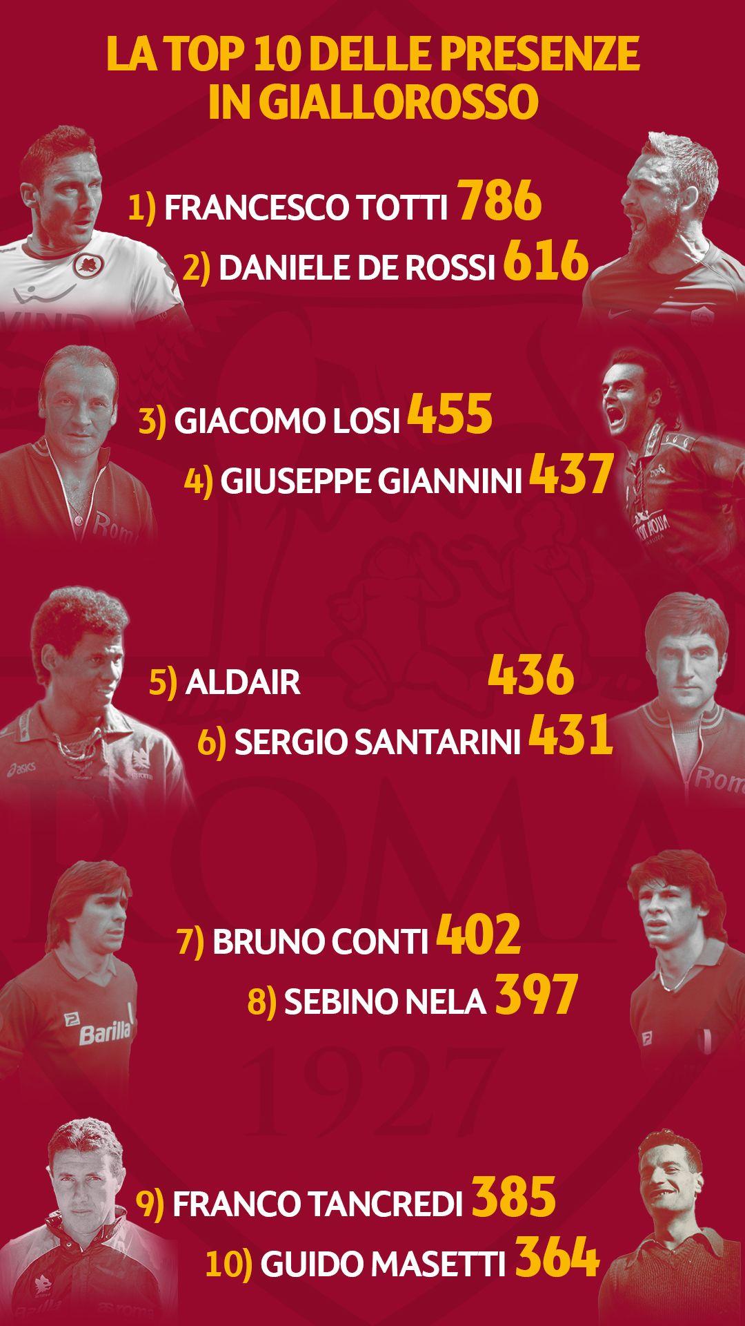 Ma quali sono i dieci calciatori che sono scesi più volte in campo con la maglia della Roma? Scoprilo nella nostra top 10...