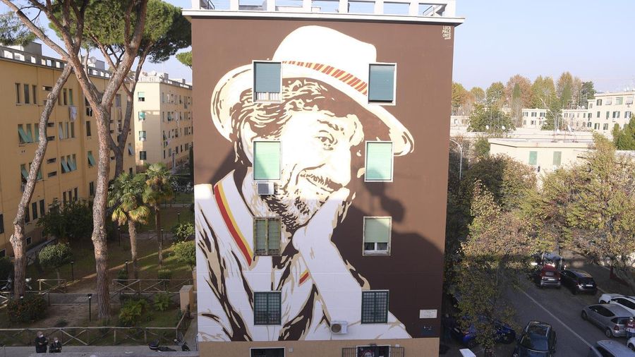 L'imponente ritratto, che si sviluppa su una superficie di 11x15 metri, nasce dalla volontà della Regione e dell’AS Roma di omaggiare il grande artista, rispondendo anche alla richiesta degli abitanti del popolare quartiere romano di celebrare la memoria del loro amatissimo “vicino di casa” con un segno che potesse renderne indelebile il ricordo. La realizzazione dell’opera ha visto anche la collaborazione della Fondazione Pastificio Cecere.