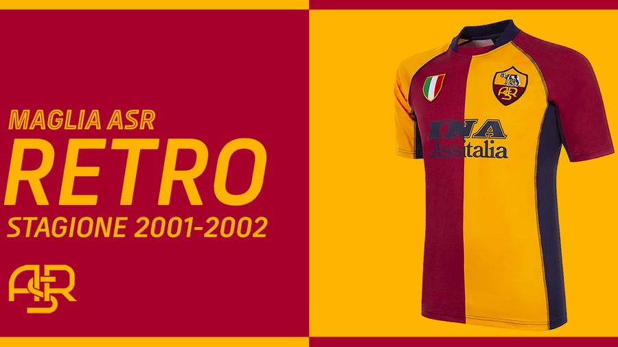 Metà gialla e metà rossa, con il tricolore sul petto, la maglia prodotta in collaborazione con Copa ripropone fedelmente il modello indossato dalla squadra durante le partite della Champions League 2001-02.