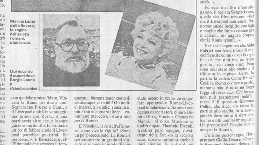 Il giornalista chiamò poi Sergio Leone. "Ed ecco - scrive De Luca sul Messaggero - un altro tifoso sfegatato, il regista Sergio Leone, quello dei film western: Per me il Liverpool non esiste. Sono romanista incallito, con figli e moglie che impazziscono per il calcio... Mi auguro proprio che la Roma trionfi...".