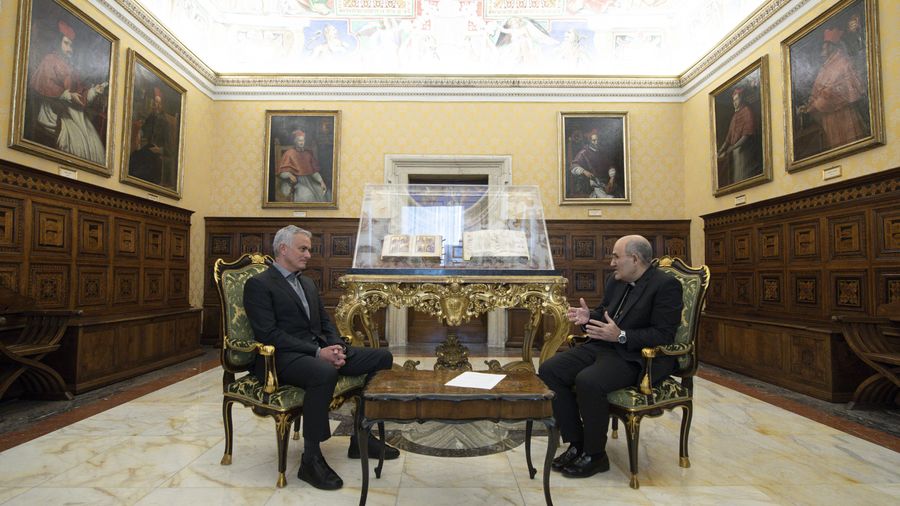 Cardinale Tolentino: "Volevo iniziare questa conversazione con lei, José Mourinho, e per me è una grande felicità questo incontro con lei nella Biblioteca, ricordando, curiosamente, un maestro comune, perché abbiamo un maestro in comune.