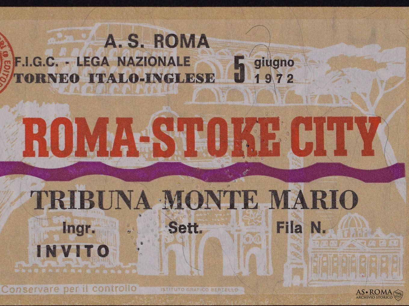 Biglietto di invito valido per l'accesso in Tribuna Monte Mario in occasione dell'incontro Roma-Stoke City 2-0, seconda giornata del Gruppo 1 del Torneo Anglo-Italiano 1972, Roma, Stadio Olimpico, lunedì 5 giugno 1972.