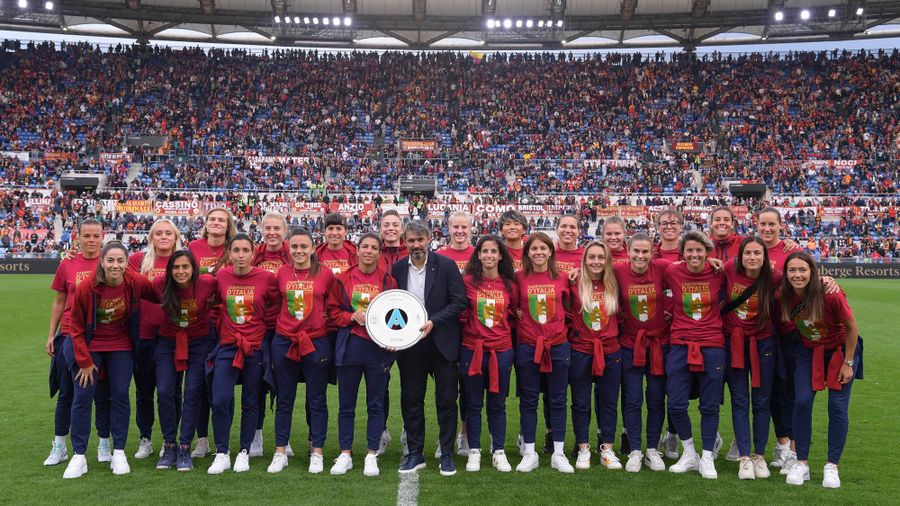 Le giallorosse hanno fatto il giro di campo dell'Olimpico mostrando ai tifosi il trofeo, primo campionato vinto nella storia del Club. Ecco la gallery della celebrazione.