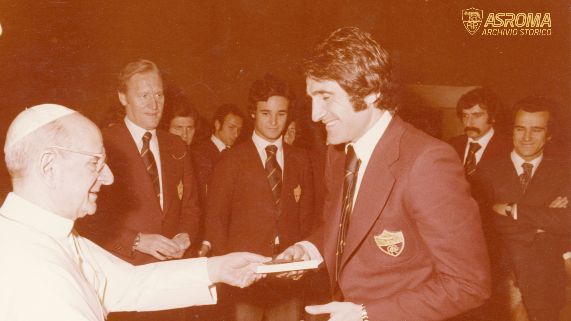 Questa immagine è altamente spettacolare. Nel corso della stagione 1973-74, la Roma viene ricevuta da Papa Paolo VI. Alle spalle di Santarini in primo piano si vedono, da sinistra, Nils Liedholm, Francesco Rocca Claudio Ranieri e Paolo Conti.