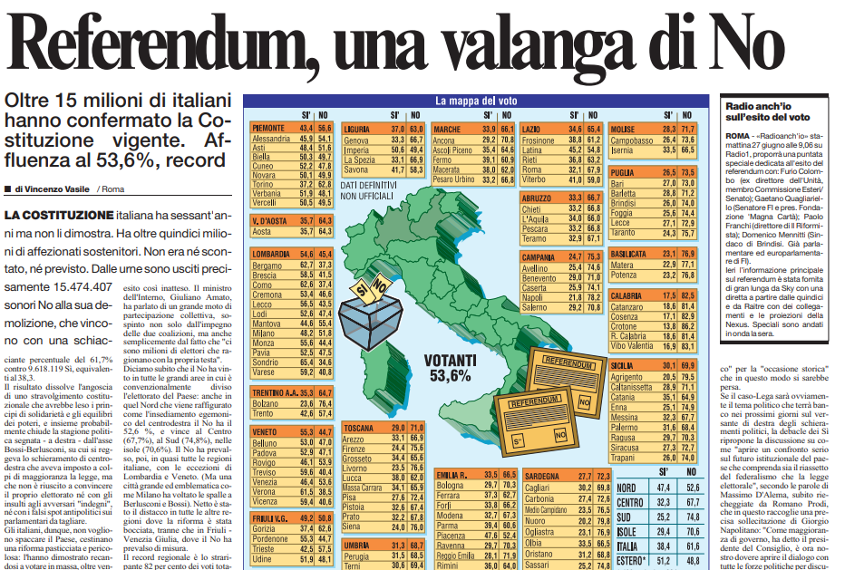 Il 25 e il 26 giugno 2006 – dunque nel giorno prima e della partita – in Italia si va alle urne per un referendum costituzionale promosso dal centro-destra per modificare sotto più profili la seconda parte della Costituzione italiana. Con la vittoria del Sì si procede al cambiamento, con il No la Costituzione continuerebbe sulla strada intrapresa nel 1948 (anno di entrata in vigore). Vince il No, con oltre il 61% delle preferenze.