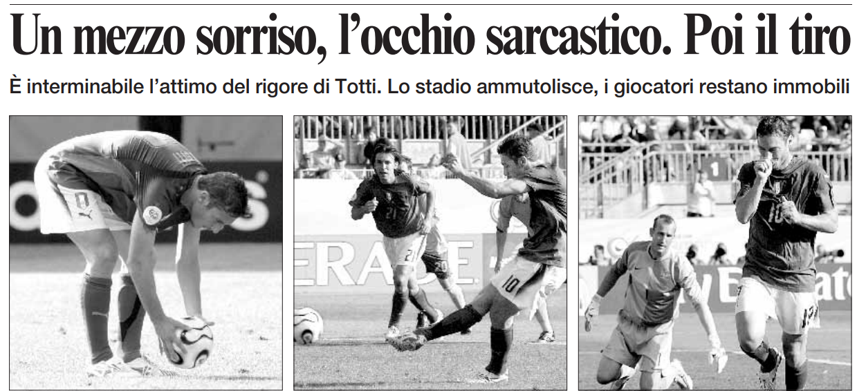 La leggendaria inquadratura dell’espressione e degli occhi di Francesco, come nei migliori film di Sergio Leone, inizia quando il cronometro segna 94:10. La camera indugia ancora di più con il passare dei secondi, a cogliere il dettaglio ancora più stretto dello sguardo concentrato del 10 azzurro. 94:22 si sente il fischio. Parte Totti, destro potente alla destra di Schwarzer, gol. La palla entra in rete a 94:26.
