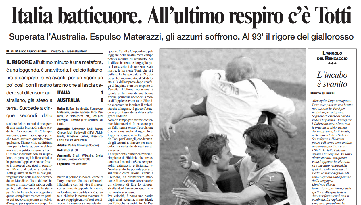 Quello di Totti all’Australia resta l’unico gol segnato da Totti nella fase finale di un Mondiale. Ma decisamente pesante e spartiacque per quel torneo. Roberto Cotroneo – giornalista, saggista, poeta – il giorno dopo sull’Unità scrive: “(…) Certo è vero un fatto: se in campo si stava attenti, si sarebbe visto che appena è entrato Totti, agli australiani è venuto il panico e sono indietreggiati tutti, come a ripararsi da un uragano che arrivava da lontano (…)”.