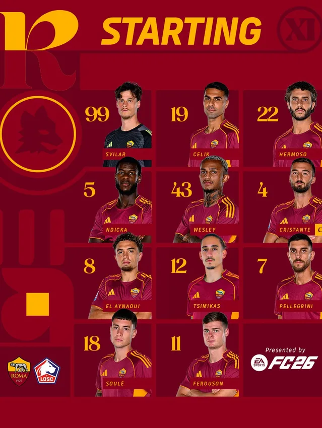 © 2018/2025 Soccer S.r.l. – P.IVA 09305501000 - tutti i diritti riservati. I nomi AS Roma, i loghi e le immagini sono marchi registrati o non registrati di Soccer S.r.l. Tutti gli altri marchi possono essere di proprietà dei rispettivi titolari.