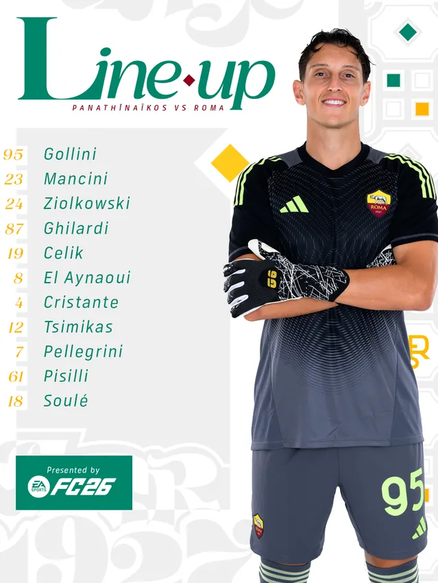 Il Panathinaikos risponde con questo schieramento: Lafont; Palmer-Brown, Ingason, Touba; Katris, Bakasetas, Siopis, Kyriakopoulos; Taborda, Pantovic, Zaroury